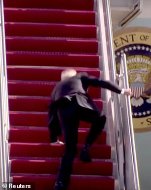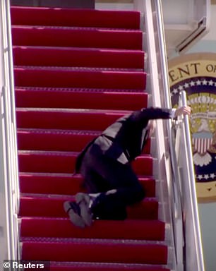 Biden was also known for often tripping up the stairs of Air Force One. Pictured: Biden falling up stairs of Air Force One at Joint Base Andrews as he departed for Atlanta, Georgia to visit the Centers for Disease Control (CDC) in March 2021