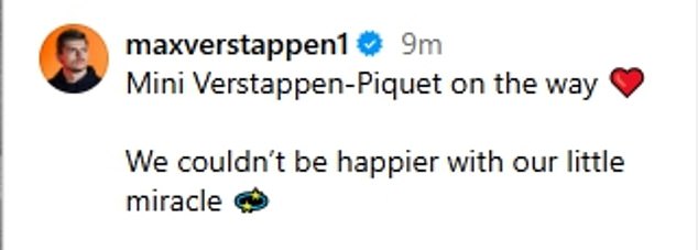The caption read: ‘Mini Verstappen-Piquet on the way. We couldn’t be happier with our little miracle’.