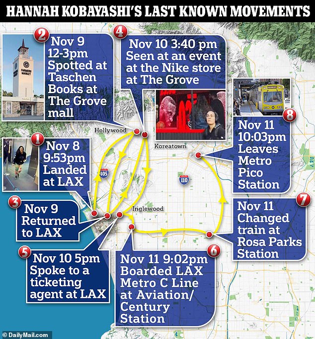 Kobayashi, 30, was caught on security camera footage disembarking a plane at LAX just before 10pm on November 8 but law enforcement say she is ‘voluntarily missing’