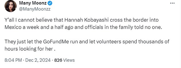 ‘Y’all I cannot believe that Hannah Kobayashi cross the border into Mexico a week and a half ago and officials in the family told no one,’ one person wrote on X.