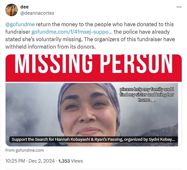 ‘Return the money to the people who have donated to this fundraiser,’ another added. ‘Police have already stated she is voluntarily missing. The organizers have withheld information from donors.’