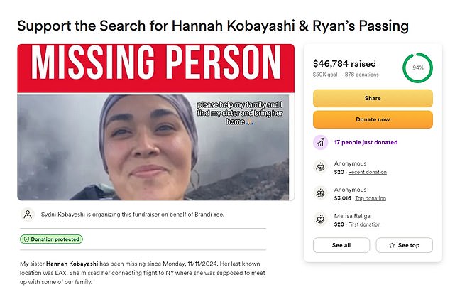 Kobayashi’s family set up the fundraiser, which has raised more than $47,000, to aid the search for the aspiring photographer, who disappeared from LAX airport after missing a connecting flight on November 8.